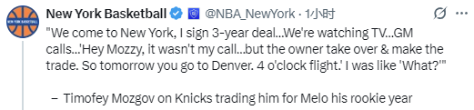 莫兹戈夫说道:“当时我刚到纽约,还签了一份3年的合同……我们正在看电视,总经理突然打来电话,说:‘嘿,莫兹(莫兹戈夫的昵称),这不是我决定的,但球队老板插手了,坚持要做这笔交易。所以明天你得去丹佛,坐4点的飞机。’我当时整个人都懵了,脱口而出‘什么?’”