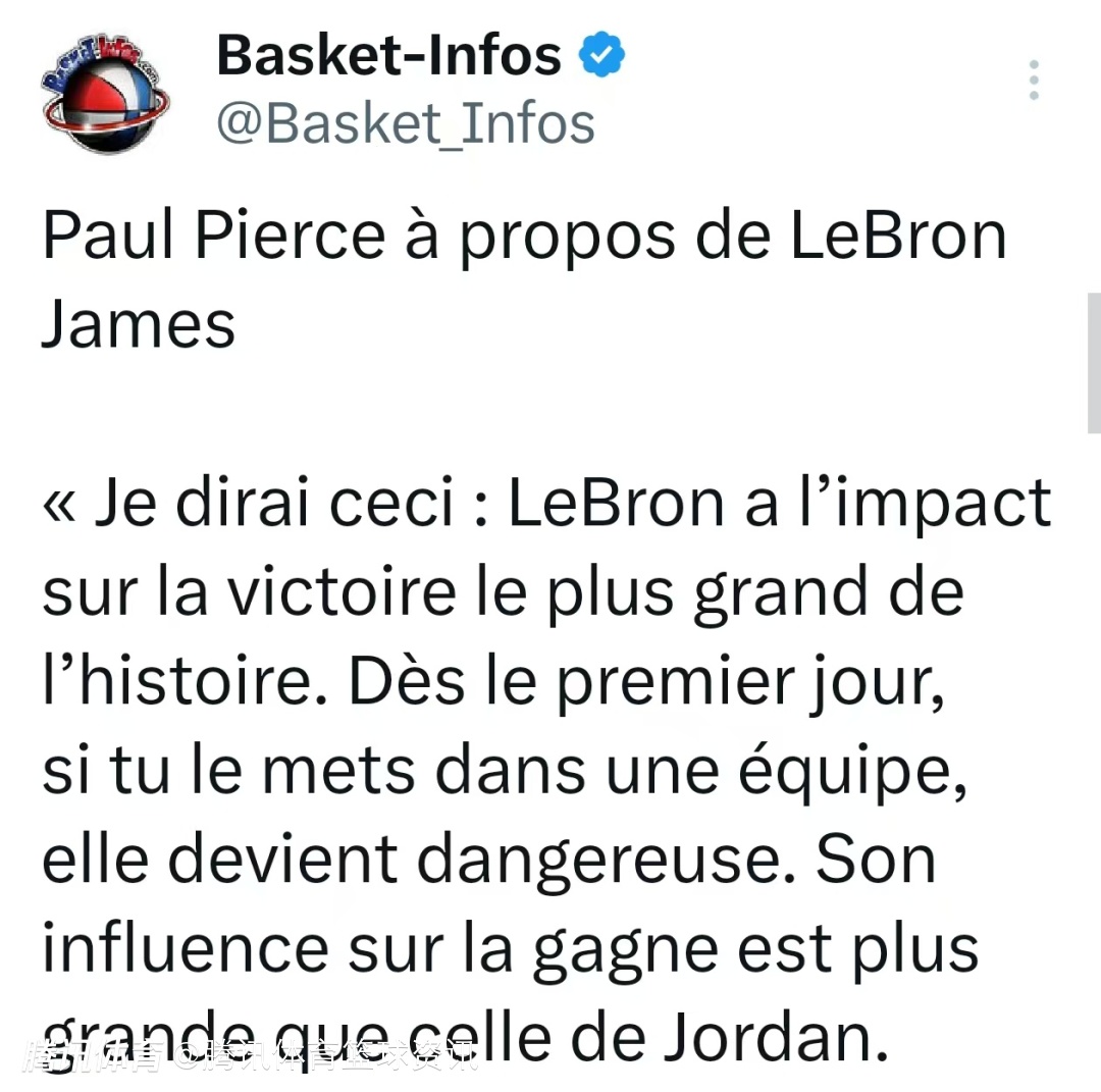 皮尔斯:詹姆斯对胜利影响力超过乔丹 他的球队大多数时候都不是夺冠热门