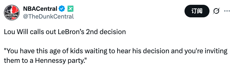 随后路威也表示:“这事儿说到底就是詹姆斯想博关注呗,你也看到上一个这么干的人是什么下场了,所以我反正不感冒,作为家长我也觉得这么做不太好。当初你第一次拿 “是否退役” 说事儿,是为了男女童子军,这还说得过去。可你这次又来这么一出,还把孩子卷进来,我女儿都问我‘勒布朗要退役了吗’,现在这一拨孩子都在等着听他的决定,结果呢?你却邀请他们去一场轩尼诗派对?你想想这像话吗?所以啊,作为家长我是真不喜欢这种操作,但你也懂,生意就是生意,赞助商也得照顾到,没办法呗。”