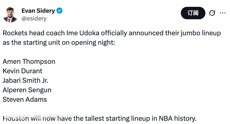 乌度卡表示,球队将沿用此前在季前赛使用过的双塔阵容,首发五虎分别是:阿门-汤普森、杜兰特、小贾巴里-史密斯、申京、亚当斯。随后美记Evan Sidery跟进报道,称火箭的这套首发阵容是历史最高。
