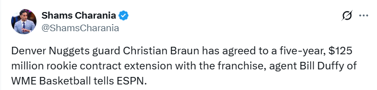 2025-10-21 03:50北京时间10月21日,据名记Shams报道,掘金队与布劳恩已达成一份为期五年、价值1.25亿美元的新秀合同续约协议。