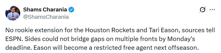 火箭的媒体人Will写道:“火箭队与伊森未能在今日截止日期前达成续约,好消息是,这并不意味着我们会失去他。受限制自由球员制度的存在,能防止球员在新秀合同到期后直接离队。明年夏天,无论伊森收到何种报价,火箭队都有权匹配。但坏消息也有两点。一是我不确定伊森会如何看待这次未能续约 —— 显然他非常希望能敲定这份合同,我也绝不希望他下赛季陷入‘证明自己’的被动局面。二是尽管这并不代表伊森会在自由市场离队,但这确实会增加火箭队考虑交易他的可能性。”