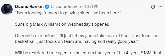 2025-10-21 06:40北京时间10月21日,太阳中锋马克-威廉姆斯在球队训练结束后接受媒体采访,谈及即将开始的新赛季。