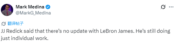 雷迪克明确回应:“关于詹姆斯的训练情况,目前暂无额外更新,他今天仅进行了个人训练。”