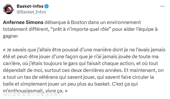 2025-10-21 07:00北京时间10月21日,凯尔特人新援安芬尼 -西蒙斯接受媒体采访,谈及加盟绿军后的心态变化与对新环境的期待,重点分享了自己在角色定位上的调整思路。