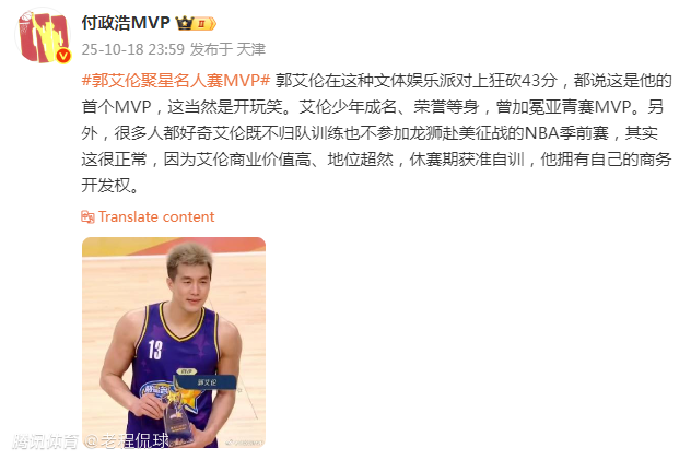 2025-10-21 07:40广州男篮后卫郭艾伦近日在某文体娱乐赛上狂砍43分当选为MVP。很多人对于郭艾伦为何既不回到广州队训练,又不随广州队出征NBA季前赛感到纳闷,对此,媒体人付政浩解释了原因。