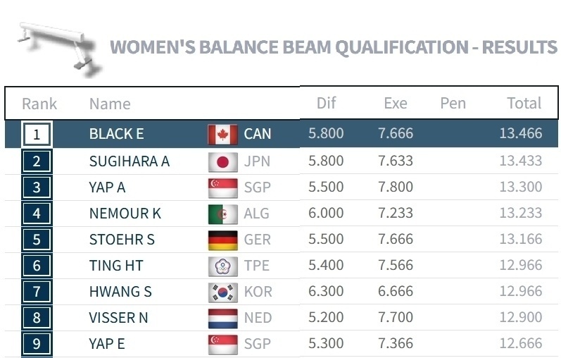 布莱克虽然跳马和高低杠排名不甚理想,但目前以13.466排在平衡木第一,这个分数虽然不高,但晋级可能就比较大了。杉原爱子以0.033分之差排在第二,新加坡选手13.30暂列第三,内穆尔排在第四。