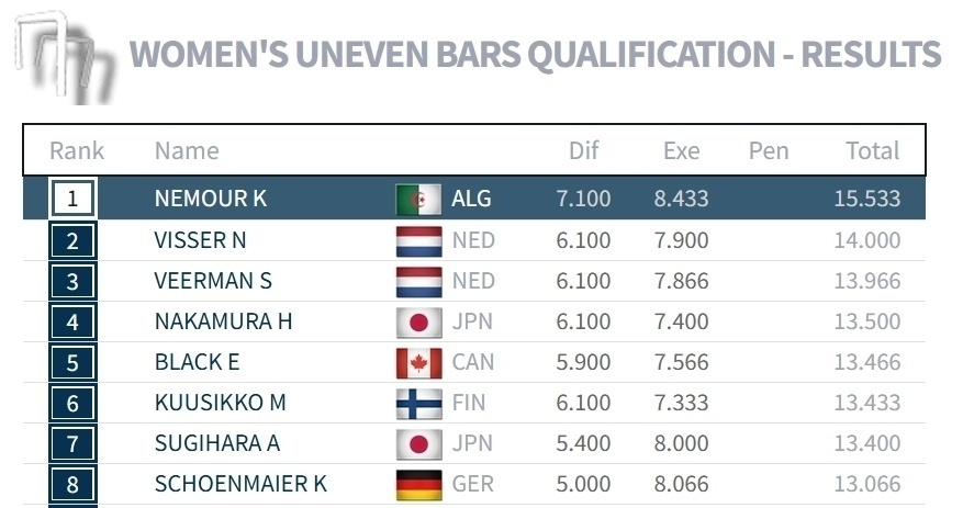 阿尔及利亚名将内穆尔在跳马、平衡木甚至自由操都出现不同程度失误的情况下,以53.865排名第二:跳马5.0/12.433、高低杠7.1/15.533、平衡木6.0/13.233、自由操5.5/12.866。
