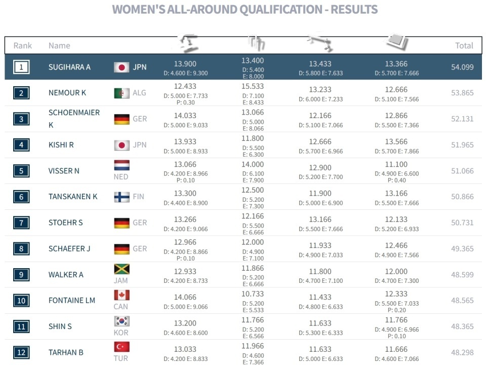 日本老将杉原爱子以54.099分排在第一:跳马4.6/13.90、高低杠5.4/13.40、平衡木5.8/13.433、自由操5.7/13.366。