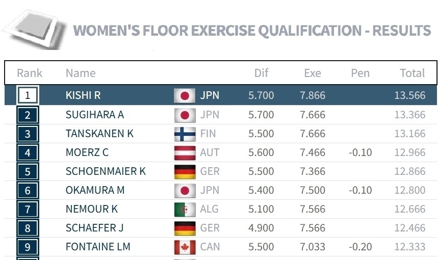 两位荷兰选手紧随其后:维瑟尔得分14.00/维尔曼则是13.966,两人也有晋级决赛可能。排名第四的中村遥香得分只有13.50-晋级形势很微妙。