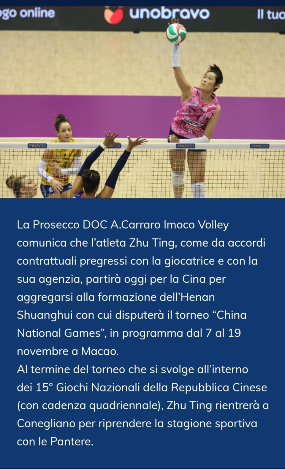 根据先前与运动员本人及其经纪公司达成的协议,运动员朱婷将于今日启程前往中国,加入河南双汇队,随队参加定于11月7日至19日在澳门举行的“中华人民共和国第十五届运动会”排球项目比赛。并在本届全运会赛事结束后,返回科内利亚诺,随“黑豹”军团继续本赛季的征程。