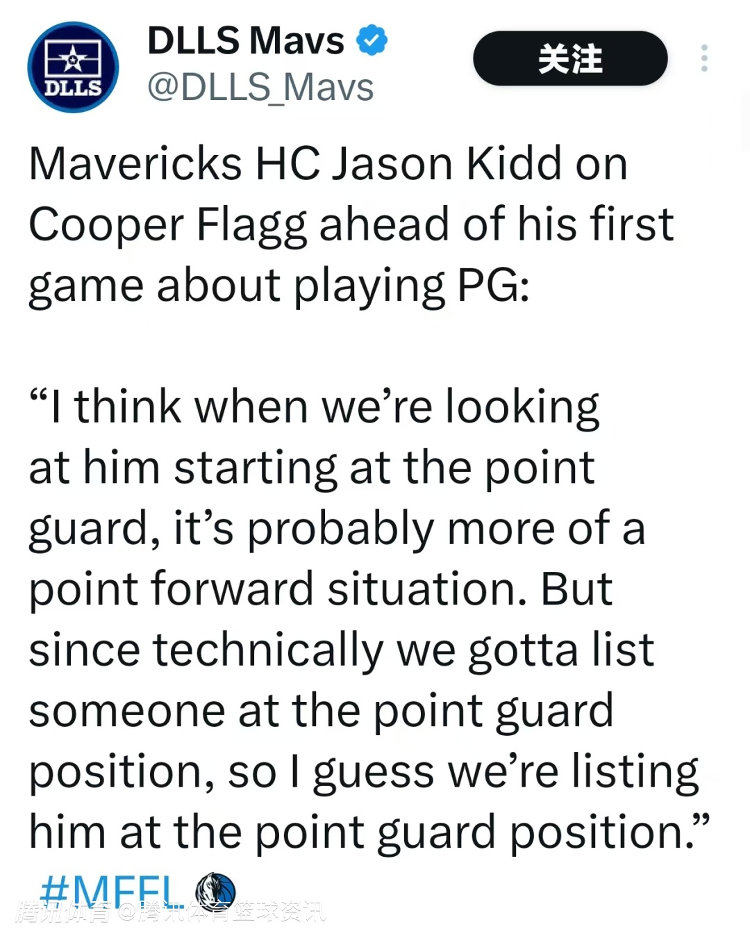 在库珀-弗拉格迎来生涯首战前,谈及让他担任控球后卫一事,独行侠主帅基德表示:“我们考虑让他以首发控卫的身份登场,但这更像是锋卫摇摆人的角色。不过从技术层面来讲,我们必须明确一名球员担任控卫位置,所以估计会把他列在控卫的位置上。”