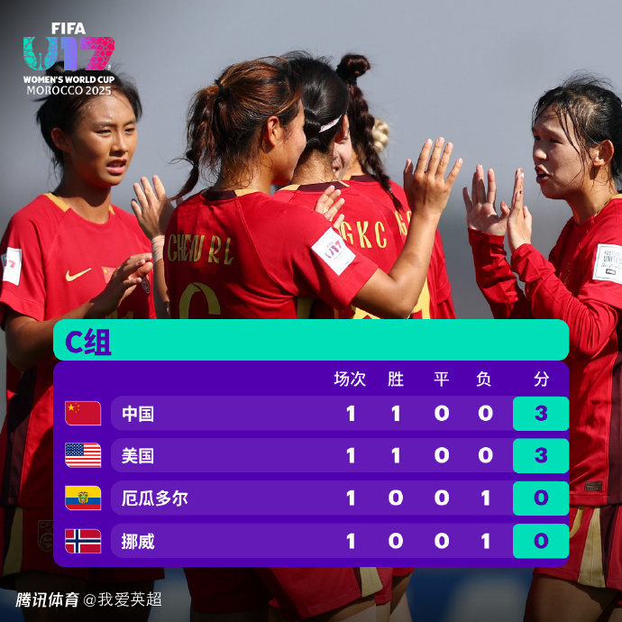 首轮战罢,两队同积3分。中国U17女足凭借净胜球优势,暂时力压美国队列榜首。