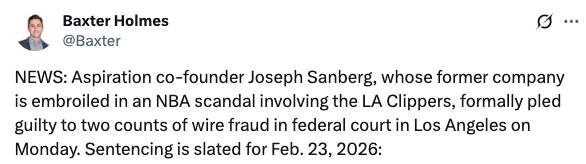 2025-10-21 11:10北京时间10月21日,据ESPN记者Baxter Holmes报道,快船球星莱昂纳德阴阳合同事件涉事公司Aspiration联合创始人约瑟夫-桑伯格已承认两项电诈罪名。