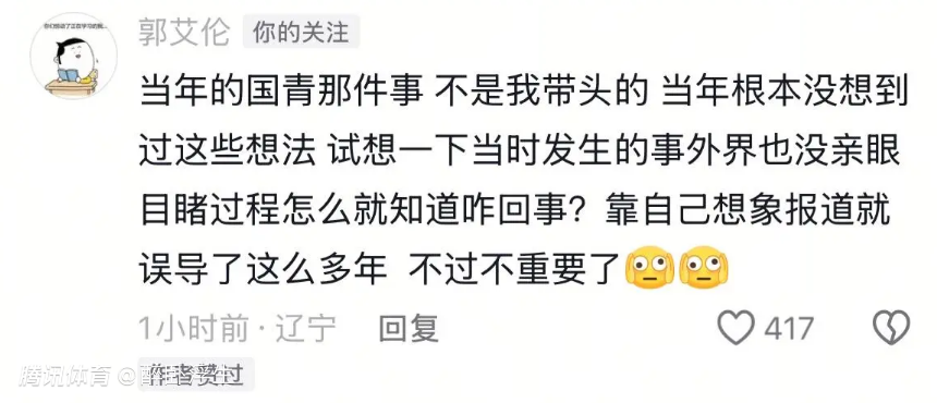 不过如今郭艾伦在回复网友关于昔日“血书门”事件时,郭艾伦给出澄清发言:“当年国青那件事,不是我带头的。当年根本没想过这些想法,试想一下当时发生的事,外界也没亲眼目睹过程,怎么就知道咋回事?靠自己想象报道,就误导了这么多年,不过不重要了。”