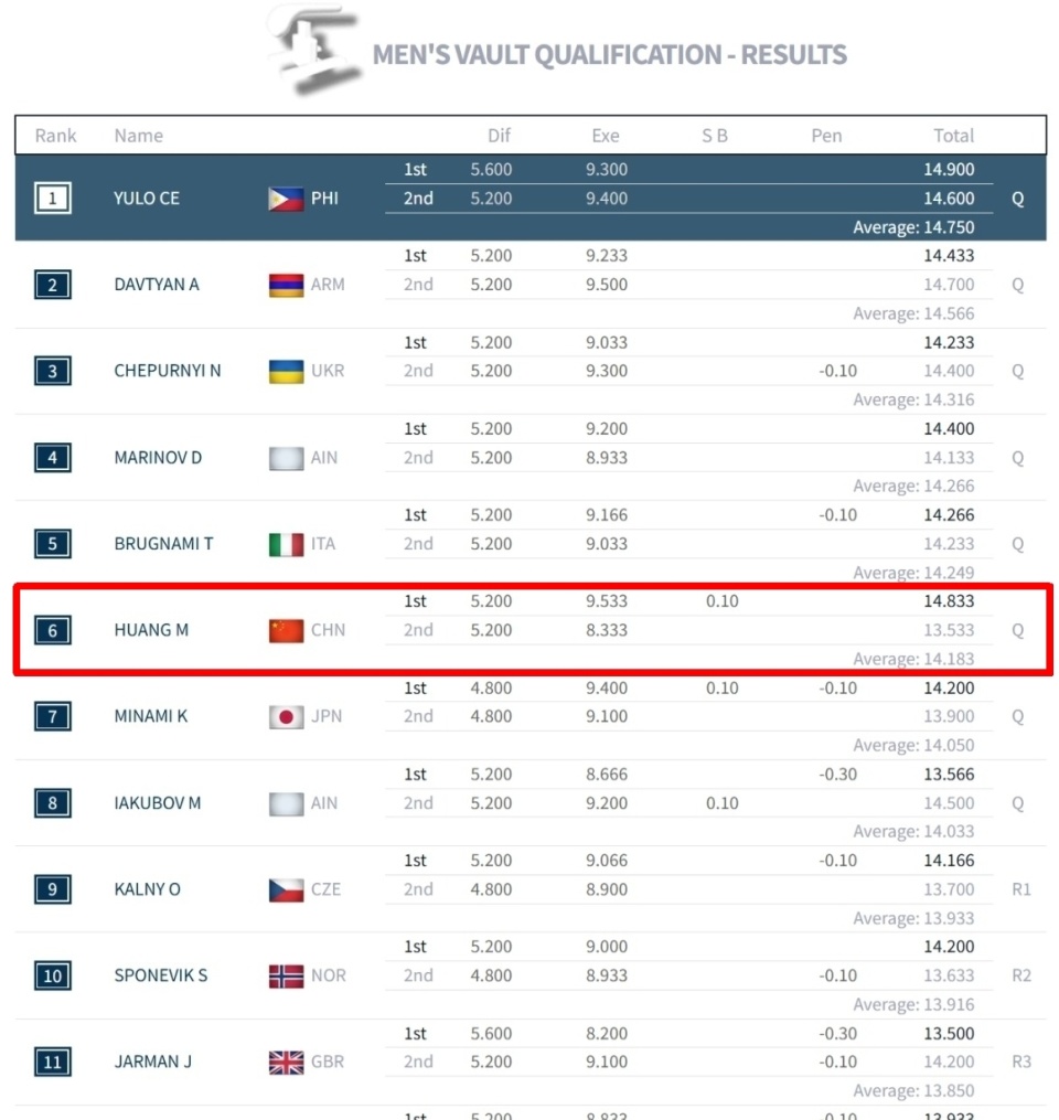 以至于整整21年来,再无中国男选手进入过世锦赛跳马单项决赛。如今随着规则修改,难度计入从10个降低到8个,外加今年是单项世锦赛,因此黄明淇就成为了22年来,第一个进入世锦赛跳马单项决赛的中国男选手!