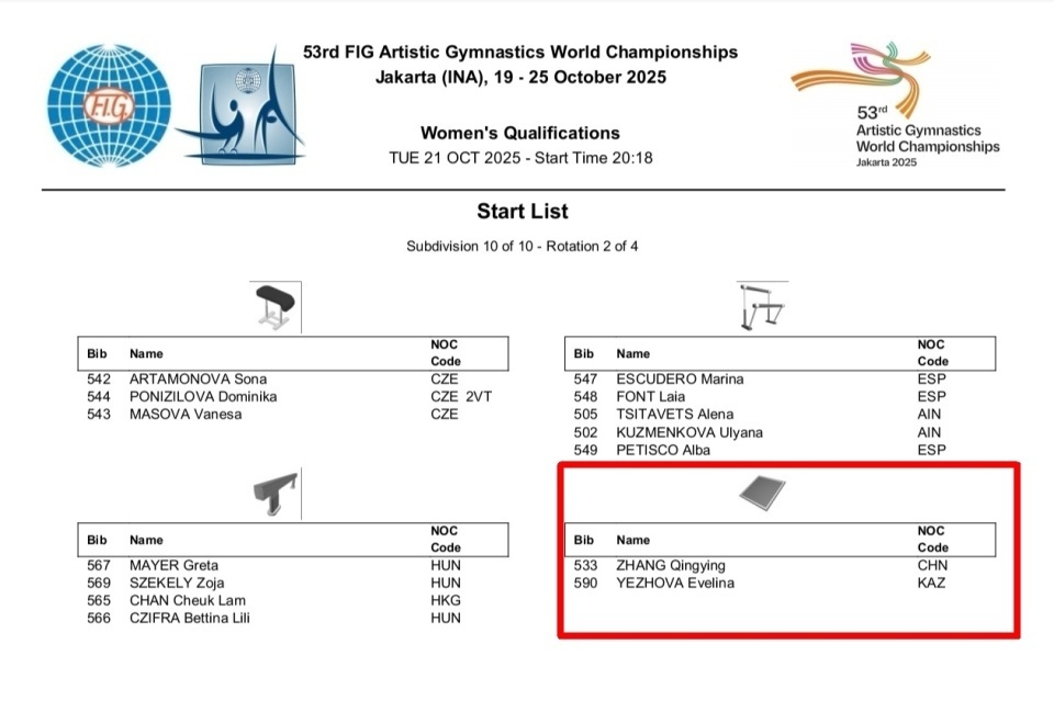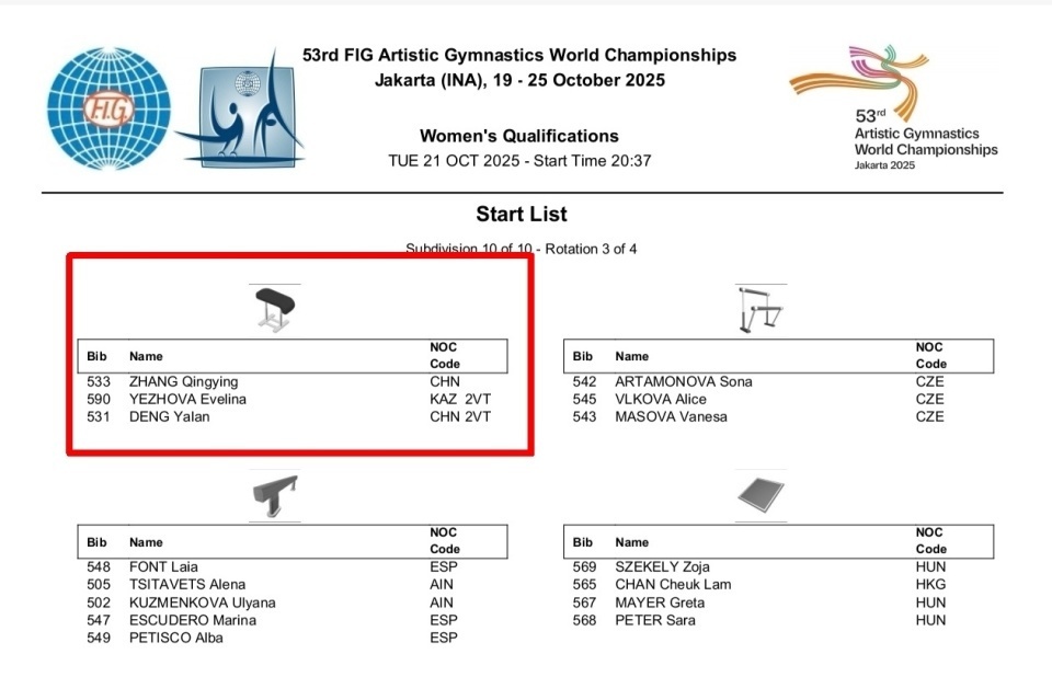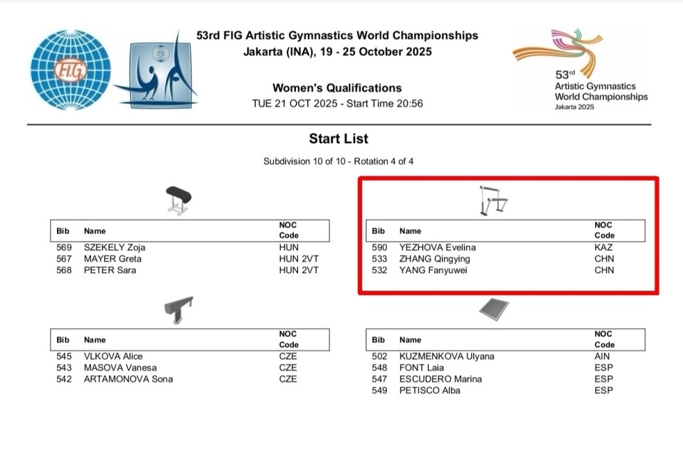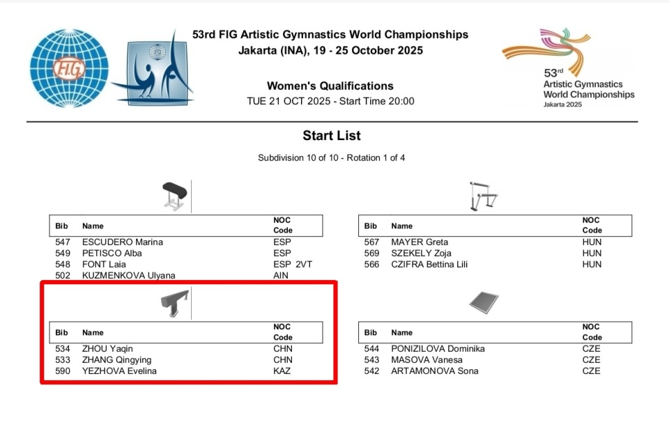 通过赛前抽签,中国队被安排在资格赛第10组,于今天晚上21:00-22:15,按照平衡木-自由操-跳马-高低杠的顺序进行比赛。同组的还有西班牙+中立选手、匈牙利+中国香港、 捷克,以及与中国同小组,每轮器械相同,只是出场顺序不同的哈萨克斯坦选手伊芙琳娜.叶佐娃。
