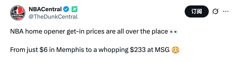 NBA常规赛主场揭幕战票价差异显著:灰熊6美金垫底 尼克斯233美金居首