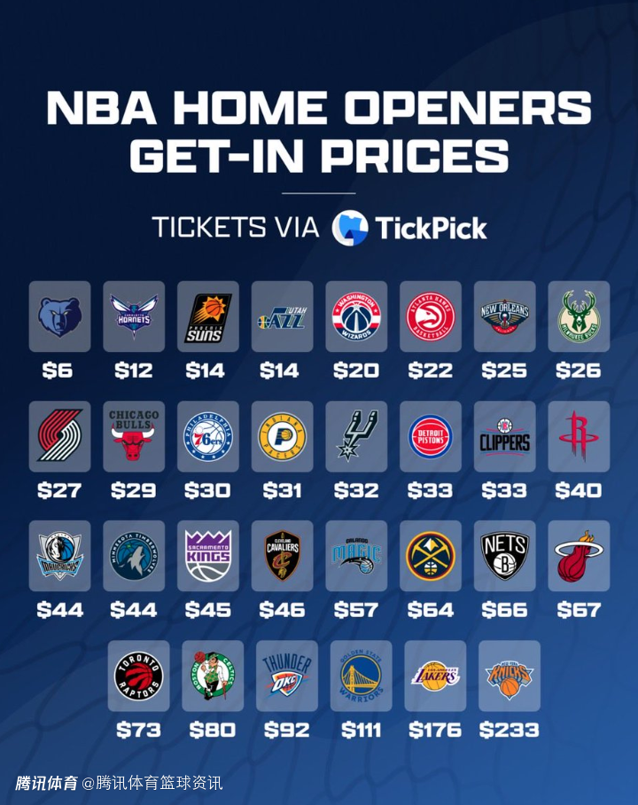 2025-10-21 23:10北京时间10月21日,新赛季NBA常规赛将于明日重燃战火,据美国票务账号TickPick统计,新赛季主场揭幕战最低票价为灰熊的6美金,最高的则是尼克斯的233美金。