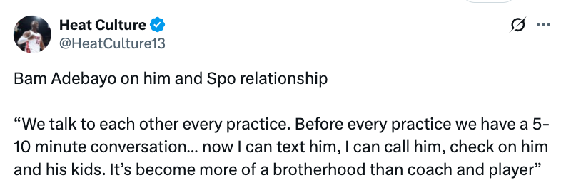 如今,热火队每次训练前,阿德巴约与斯波斯特拉都会单独交流。“每次训练前,我们都会聊5到10分钟,” 阿德巴约说,“话题可能是孩子、生活,也可能是篮球,每次都不一样。现在我能给他发消息、打电话,关心他和他的家人,我们更像兄弟,而不只是教练和球员。”