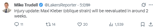2025-10-21 23:40北京时间10月21日,根据湖人队记者Mike Trudell报道,湖人队球员克勒贝尔(腹斜肌拉伤)将在两周后接受重新评估。