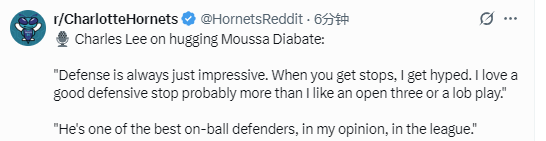 2025-10-22 00:00北京时间10月21日,黄蜂队主教练查尔斯-李称赞了迪亚巴特。