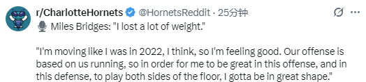 2025-10-22 00:50北京时间10月22日,黄蜂队球员迈尔斯-布里奇斯接受媒体采访,透露自己在休赛期减轻了体重。