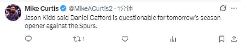 2025-10-22 01:20北京时间10月22日,独行侠队主教练基德透露,加福德对阵马刺队的状态为出战成疑(50%的可能出战)。