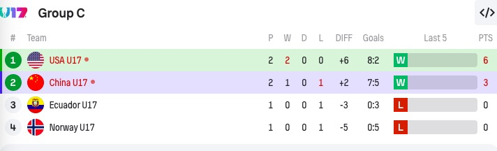 中国U17女足遭遇本届世界杯首败,2轮过后1胜1负积3分暂列小组第2位;美国队2战全胜积6分排名小组第1。