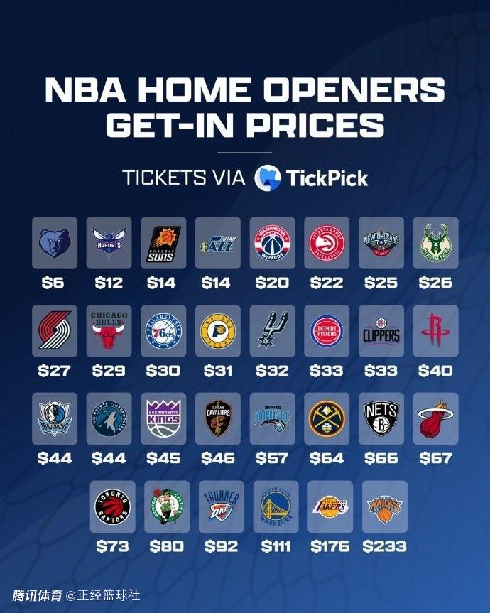 30队主场揭幕战最低门票排名:纽约力压湖人勇士居首 灰熊仅6美金垫底