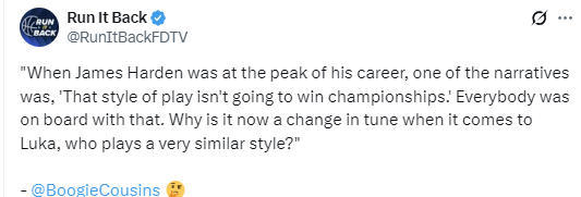 考辛斯说道:“当年詹姆斯-哈登处于职业生涯巅峰时,外界流传的说法之一是‘这种打法拿不到总冠军’,所有人都认同这套说辞。可到了打法极为相似的东契奇这里,外界的论调为何就变了呢?”