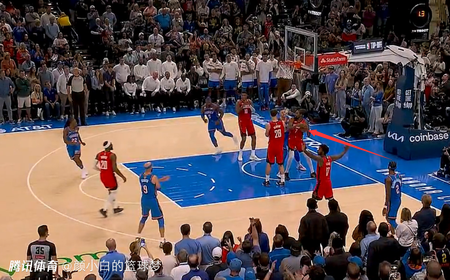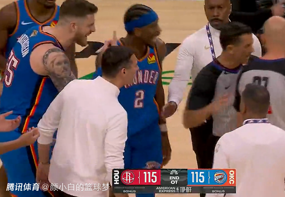 SGA绝杀不中,杜兰特保护了后场篮板,这时候火箭已经没有暂停了,杜兰特比了一个暂停的手势,杜兰特本该吃一个技术犯规,但裁判没有给,雷霆主帅戴姆波特十分愤怒冲入场内,但裁判说比赛已经结束了。