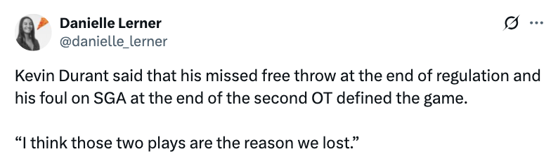 随后杜兰特也表示,常规时间末他罚丢的那记罚球,以及第二个加时末对亚历山大的犯规,决定了比赛的走向:“我认为正是这两个回合导致我们输了球。”