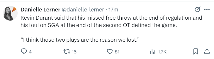 不过赛后杜兰特还是对球队输球揽责了,他表示:我常规时间丢了最关键的罚球,第二个加时赛又犯规让对手领先1分,我认为这两个回合就是我们输球的原因。