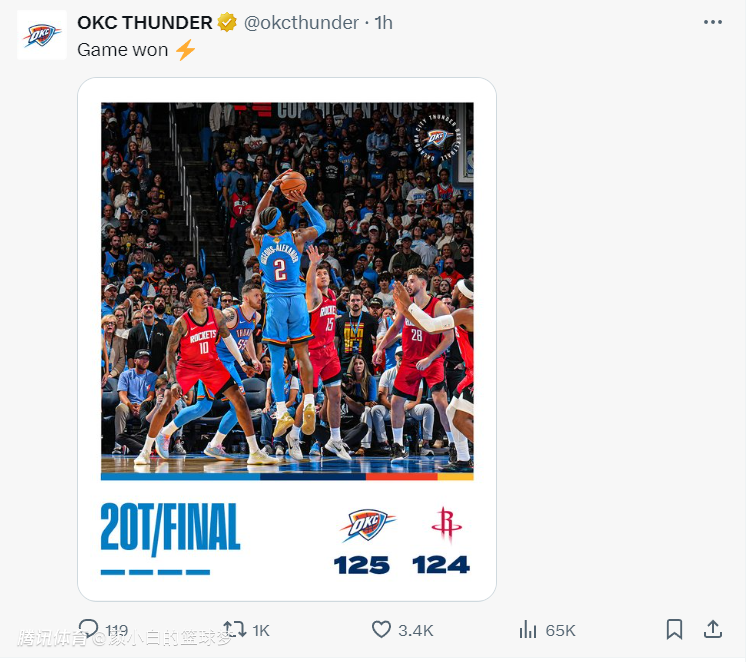 2025-10-22 12:50火箭124-125惜败雷霆,NBA揭幕战就双加时,这两支球队的硬实力都非常强劲,最终SGA制造杜兰特第六次犯规,用罚球准绝杀了火箭队,SGA与申京两位超巨都拿到35+的数据。