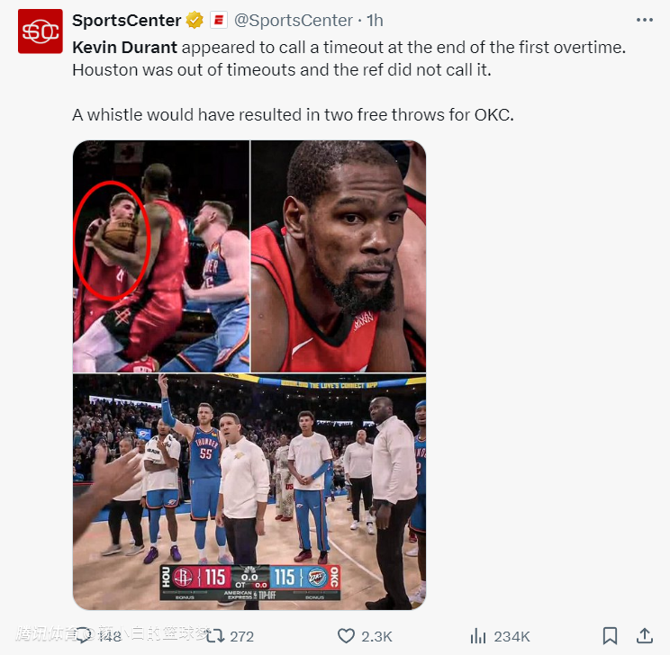 美媒SC都写道,第一个加时赛结束后杜兰特疑似比了一个暂停的手势,火箭没暂停了,他本来应该得到一个技术犯规,那样雷霆就可以提前罚球绝杀比赛了。