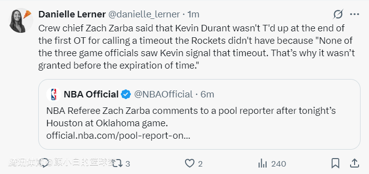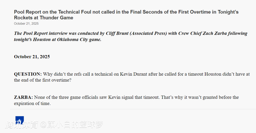 NBA裁判官方回应了为什么没有给杜兰特T,官方写道:三位裁判都没有看到杜兰特示意暂停的动作,这就是为什么没有给杜兰特技术犯规的理由。