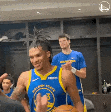 2025-10-22 14:00北京时间10月22日,NBA常规赛,勇士以119-109力克湖人,取得开门红,赛后勇士更衣室内,勇士今年的次轮秀理查德被奖励拿到了今天的比赛用球。拿到比赛用球的理查德也是满脸笑容,和所有人拥抱致意。
