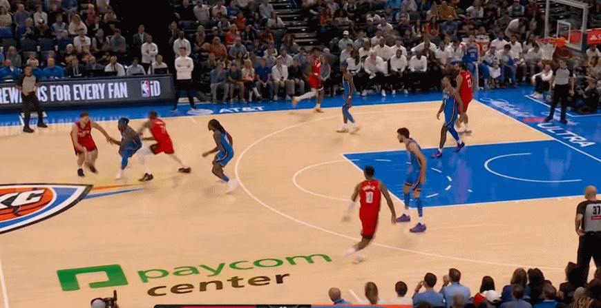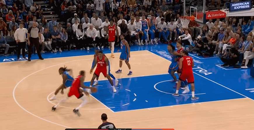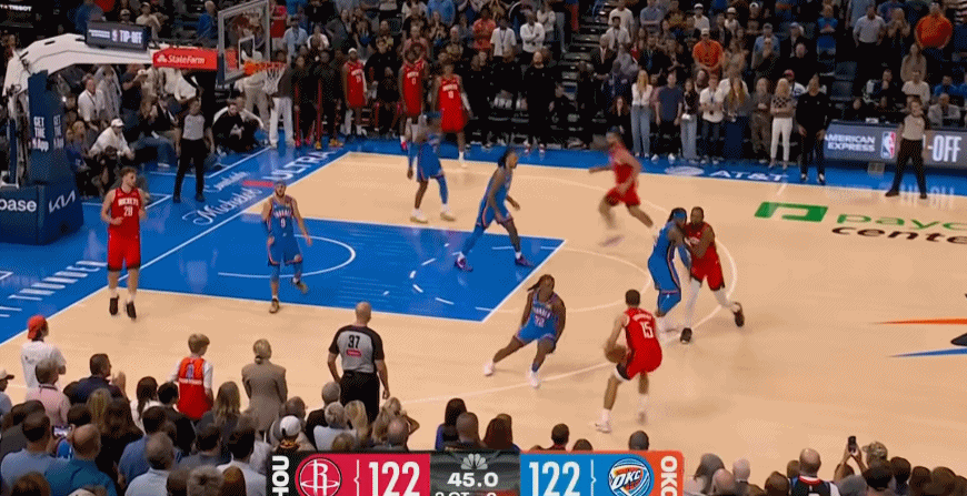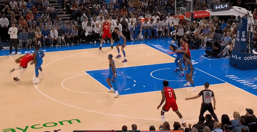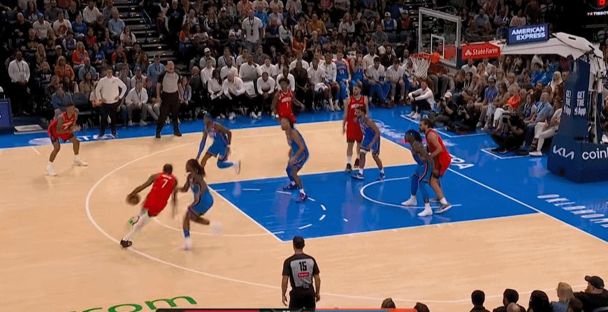 这个回合是典型。由于阿门、申京和亚当斯在靠近底线的位置形成直线站位,雷霆可以肆意收缩。杜兰特的罚球线运球突破踉踉跄跄险些失误,小史密斯持球再突依然脚步凌乱无处可走。感官上,火箭很多进攻回合犹如走钢丝,处在失误的边缘。
