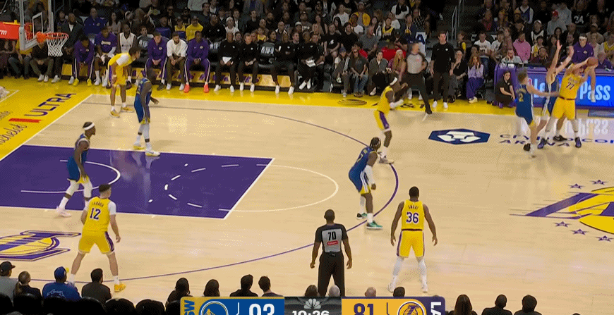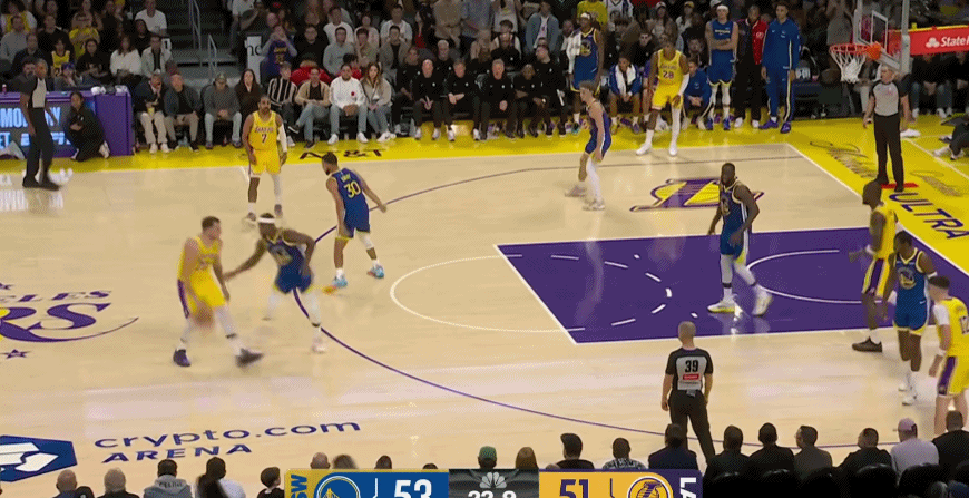 这个回合,库里与库明加交叉掩护,八村垒在换防与不换防之间愣神,库明加空切篮下得手。
