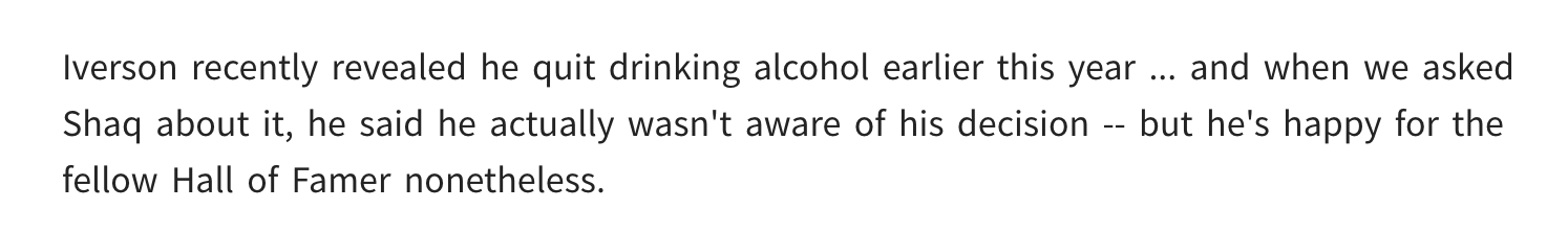 奥尼尔表示,艾弗森只是个“普通人”,他热爱家人、努力拼搏,且始终保持真实的自我,这也是奥尼尔最欣赏他的地方。艾弗森近期透露,自己在今年早些时候已戒酒。当记者就此向奥尼尔提问时,他表示此前并未知晓艾弗森的这个决定,但依然为这位同为名人堂成员的球员感到高兴。