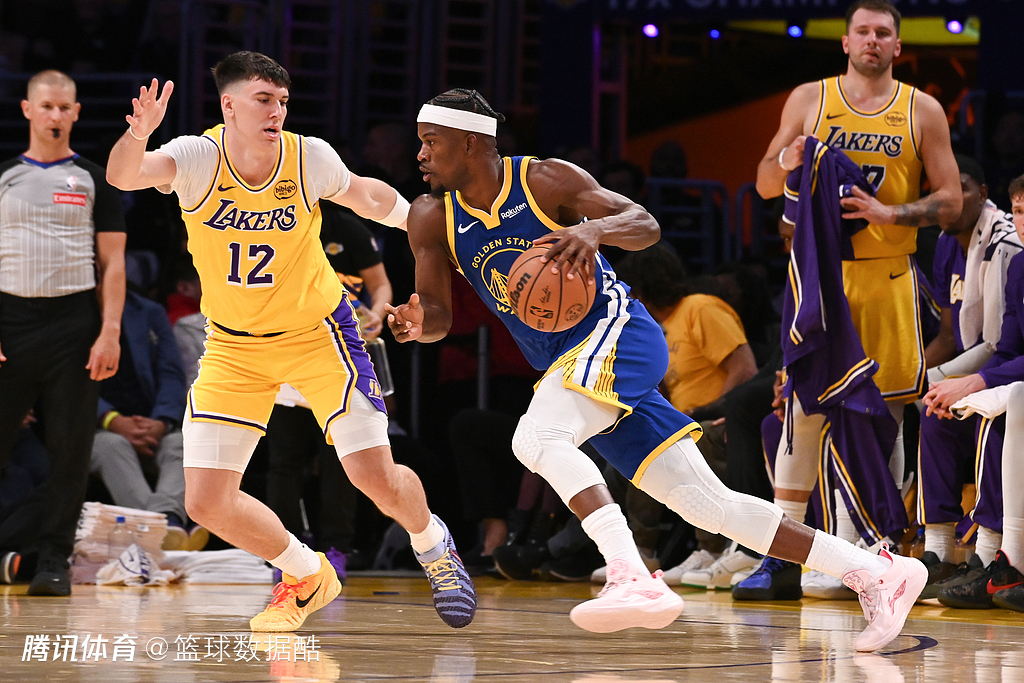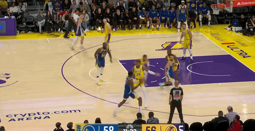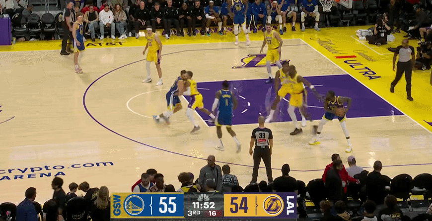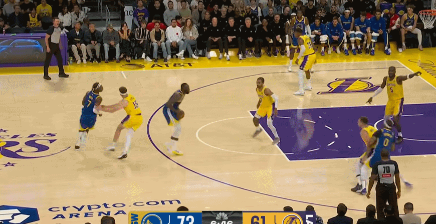 此役,湖人有大量交代不清的防守回合,在换防与不换防之间,防守人总是愣神,碰到勇士这种传切大队,这是致命的问题。比如库明加的这个三分和空切,艾顿和八村就一个愣神的功夫,库明加就得到了出手机会。