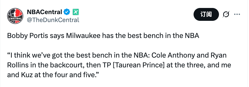 波蒂斯:雄鹿拥有全联盟最好的替补阵容 后场侧翼内线均有得力人手