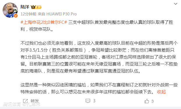 媒体人陆洋则认为,申花在亚冠取得首胜,却很可能在中超给自己带来“麻烦”,“三支中超球队首发最完整态度也最认真的球队取得了胜利,祝贺申花队。不过我们也必须无奈地看到,这支投入度最高的球队目前在中超的形势是落后两个对手3.5/1.5分,争冠希望比较渺茫;而在他们离榜首差距只有1分且马上主场踢成都之前的亚冠首轮,客场对江原也同样选择做出了很大的保留。目前联赛第三的位置很可能在来年无缘亚冠赛场,而亚冠三轮之后唯一不胜垫底的海港队,则是现在最有希望通过联赛冠军直通亚冠的队伍。”