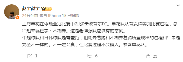 媒体人赵宇直接表示,申花全主力出战就是不糊弄,也是老牌球队应有的态度,“上海申花在今晚亚冠比赛中2比0击败首尔FC。申花队从首发阵容到比赛过程,总结起来就仨字:不糊弄。这是老牌强队应该有的态度。中超球队和日韩球队是有差距,但糊弄着踢和不糊弄着踢所呈现出的过程和结果是完全不一样的。不一定会赢,但比赛过程不会骗人。恭喜申花队。”