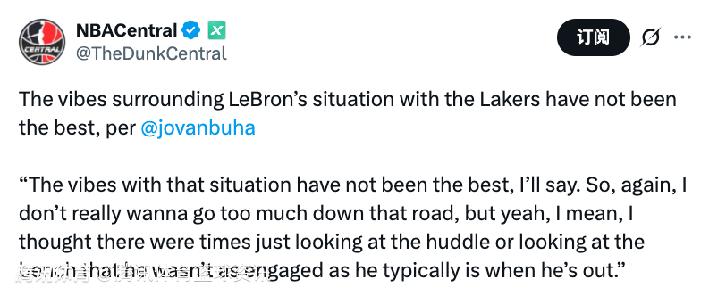 2025-10-23 01:10北京时间10月23日,据湖人队记乔万-布哈报道,詹姆斯当前在湖人的情况并不是很好。