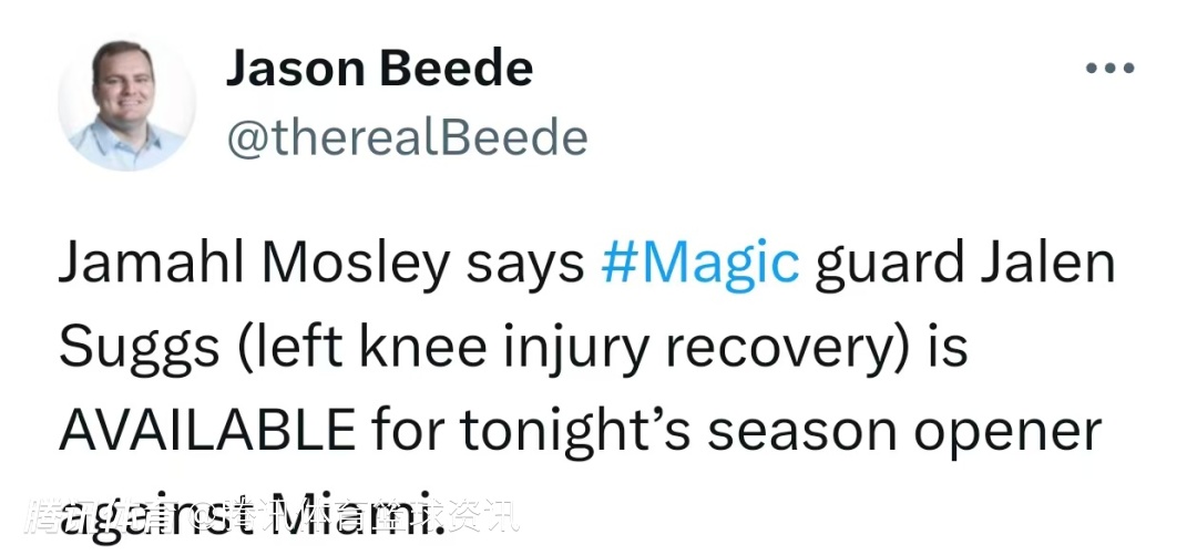 2025-10-23 06:10北京时间10月23日,据队记Jason Beede报道,魔术队主教练莫斯利今日确认,球队控球后卫萨格斯将能出战对阵热火队的常规赛揭幕战。