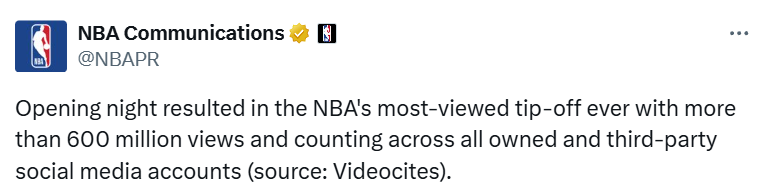 据Videocites统计的信息显示,本次NBA揭幕战中,火箭与雷霆、勇士与湖人的两场比赛创下联盟历史最高揭幕战观看纪录,在所有官方及第三方社交媒体平台上,累计观看量已突破6亿次,且这一数字仍在持续增长。