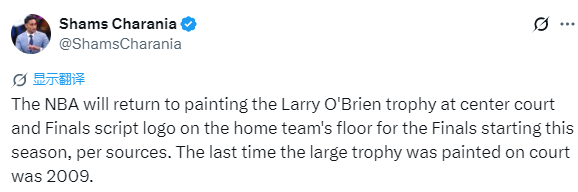 2025-10-23 07:10北京时间10月23日,根据名记Shams的报道,从本赛季开始,进入NBA总决赛的球队将重新在球场中圈绘制拉里-奥布莱恩冠军奖杯图案,并在主队球场地板上绘制总决赛手写体标志。上一次这么做是在2009年。