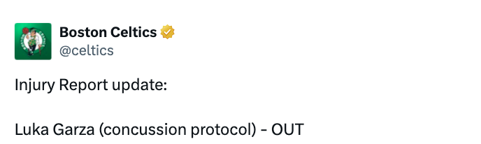 愿无大碍!凯尔特人官方:加尔扎遭遇脑震荡 本场比赛不会回归